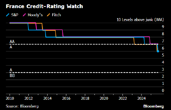 此次评级下调为本周画上句号。本周,法国总理塞巴斯蒂安·勒科尔尼暂停推进埃马纽埃尔·马克龙总统的核心养老金改革,以维持执政地位,从而使政府在不信任投票中得以存续。 此举为法国缓解了一场政治危机。此前这场危机险些导致政府再次倒台,并触发提前选举。但目前尚不清楚,在议会辩论中会出台怎样的预算——在这场辩论中,反对党议员拥有更大影响力,可抵制削减开支与增税举措。 “我不会在比赛结束前就判定结果,”莱斯科尔表示。“这场辩论将于周一开始在委员会层面展开,并持续至今年年底。能否说服观察人士——包括评级机构与金融市场——完全取决于我们。这里的‘我们’,指的是政府与议会双方。” 自2024年6月马克龙宣布举行选举以来,法国面临的政治与财政挑战已引发法国资产抛售潮,推高了该国的借贷成本。作为衡量风险的关键指标,法国与德国10年期国债收益率差近期已从提前选举前的不足50个基点,升至85个基点以上。 自勒科尔尼本周在不信任投票中过关后,这一利差已收窄至约78个基点。 “我们已提交2026年预算草案,目标是将赤字率从今年的5.4%加速降至4.7%的国内生产总值(GDP)占比,”莱斯科尔表示。“我们正在制定一份能实现这一目标的预算,但该预算必须通过投票获得批准。” 他指出,明年的财政赤字缩减只是“第一步”。“绝对目标是在2029年将赤字率降至GDP的3%以下,这将使我们能够稳定债务水平。当然,这需要付出努力,而这正是标普想告诉我们的。” 新浪财经公众号 24小时滚动播报最新的财经资讯和视频,更多粉丝福利扫描二维码关注(sinafinance)