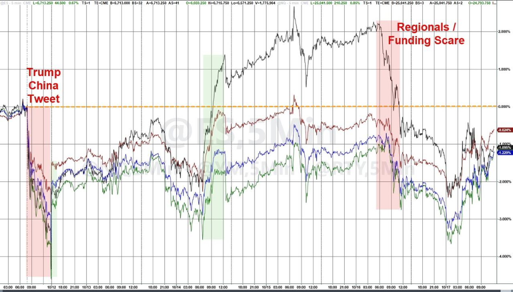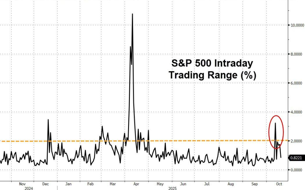 [db:图片]华尔街见闻 本周贸易冲突再燃、美国区域银行信用风险浮现以及对人工智能股票估值过高的担忧,共同引发了美股自4月以来最剧烈的市场动荡。VIX指数一度升至28.99、创4月下旬以来的最高盘中水平。此前一度火热的加密货币等风险交易也失去动力,本周下挫超8%。 “4月以来最动荡一周”结束了,市场持续已久的平静正在瓦解。 本周贸易冲突的再燃、美国区域银行信用风险的浮现以及对人工智能股票估值过高的担忧,共同引发了美股自4月以来最剧烈的市场动荡。标普500指数的盘中涨幅更是自4月以来首次突破2%。