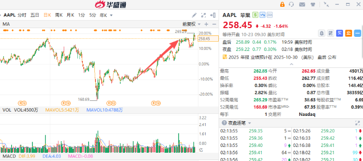 苹果此轮股价强势的表现,主要受iPhone 17系列销售超预期推动,据研究机构Counterpoint报告显示,iPhone 17系列在中国和美国市场的早期销售强劲,销量比iPhone 16系列高出14%,其中iPhone 17基本款在中国销量几乎翻了一番,市场寄望这或许意味着期待已久的换机潮正在开启。有趣的是,“股神”沃伦·巴菲特自从2024年开始大量抛售苹果股票,并在今年进一步减持,在当前看来,这可能是一个“卖飞”的决定。据相关估算,随着苹果股价本周大涨,巴菲特出售三分之二苹果持仓的决定令伯克希尔错失了约500亿美元的潜在收益。不过从当前估值而言,目前苹果当前动态市盈率超过39倍,远高于过去10年平均的23倍,也高于纳斯达克100指数平均水平,是“七巨头”中除特斯拉外最昂贵的一只股票。而据媒体跟踪的分析师中仅有58%建议买入苹果,同样也是“七巨头”中除特斯拉外“受欢迎度”比例最低公司。库克爆料苹果AI即将进入中国市场!苹果季报市场关注什么?聚焦苹果第四财季业绩,市场关注的焦点包括:关税利空缓和,iPhone销售能否持续强劲得益于芯片、显示屏、存储空间等升级让17系列的基本款性价比极高,上市初期广受消费者欢迎。Melius Research分析师认为苹果“正在重回正轨”,强调了中国市场的积极信号以及新机型整体的势头,并预计即将推出的新品将成为额外催化剂。而除iPhone 17系列需求延续外,美国运营商竞争及iPhone 18折叠屏机型(预计2026年9月推出,采用2nm A20芯片、无折痕设计)的外观革新将支撑需求。投资者将聚焦本次季报管理层对iPhone销售的指引,以及中国进口的智能手机能否继续获得豁免。