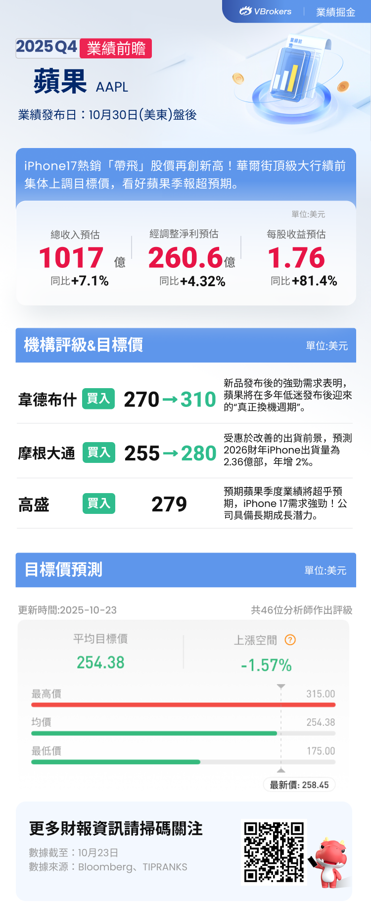 图片来源网络猜测Siri愿景依旧艰难,库克爆料苹果AI即将进入中国市场本月,苹果公司CEO库克现身上海,在全球财富管理论坛·2025对话中透露,苹果公司正在努力推动Apple Intelligence(苹果智能)进入中国市场。作为苹果智能愿景的承载,Siri将在个人情境理解、屏幕内容感知能力以及应用内操作功能迎来三大升级,但是全新设计的Siri语音助手却一直未能如期亮相。知名科技爆料人马克·古尔曼表示,虽然苹果设备在AI领域的落后似乎并没有影响产品销量(iPhone 17卖得相当不错),但负责开发“苹果智能”的团队正处于分崩离析的状态中,已经失去数十名领导者和创始成员,还有十几名顶尖AI研究人员。古尔曼甚至断言,苹果这一波AI人才离职潮还将继续。他“坚信更多的苹果资深员工将很快离开”,特别是如果明年春季发布的新Siri表现不佳的话。服务收入料表现亮眼,其它设备回暖高盛预计苹果本季度服务业务展现出较强韧性,预计营收282亿美元,同比增长13%,与市场共识持平。虽App Store支出增速放缓至10%,低于F3Q25的13%,但iCloud+、应用商店相关收入(TAC)、AppleCare+、Apple Pay等订阅服务的持续增长弥补了这一缺口。其他设备方面,Mac业务预计营收86.81亿美元,同比增长12%;iPad业务预计营收69.3亿美元,同比持平,旧设备更新支撑需求,但教育采购折扣抵消了高端机型对ASP的提振作用。华尔街顶级大行绩前上调目标价!看好苹果季报超预期据TipRanks最新数据显示,多家华尔街大行绩前上调苹果目标价,58%的机构给予“买入”评级,当前平均目标价为261.68美元,最高目标价为315美元/股。