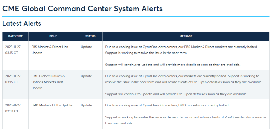 这些反应折射出芝商所已发展成为全球市场机制的重要组成部分,以及交易员日常工作中不可或缺的一环。该集团数据显示,10月份衍生品交易量日均超过2600万份合约。 11月20日,芝商所美国国债期货和期权未平仓合约总量创下3510万份的历史高位。仅E-mini标普500指数期货和纳斯达克100指数期货两类合约,每日交易的名义价值就高达约1万亿美元。 近年来交易所故障频发,技术问题影响全球多个平台的报价。 2024年6月,纽约证交所因软件更新故障而错误暂停约40支股票交易,并显示异常交易记录。同年早些时候,技术问题曾扰乱纳斯达克盘前交易近三小时。 在欧洲,伦敦证券交易所集团在2023年末短短数月内遭遇过三次故障,其中一次导致数千支股票交易中断。 此次芝商所故障持续时间已超过2019年的一次因技术错误引发的数小时故障事件,这将引发市场对该公司应急预案完善程度的质疑。 在领英平台上,嘉能可的一名员工针对相关讨论发帖评论道:“真正的黑色星期五”。 淡静交易日 股市周五本就预计会相对平静,当日没有美国经济数据公布,美联储官员也无公开发言安排。 尽管部分市场人士认为,感恩节假期及半日交易导致的流动性低于正常水平将限制波动性,但缺乏美国价格走势指引的交易困境也引发了市场不满。 Bespoke Investment Group联合创始人Paul Hickey表示,“考虑到交易时段缩短、数据匮乏,加之昨日假期导致市场波动性较低,这简直是这件事发生的最合适时机,因为成交量本就低迷。但另一方面,在流动性本就稀缺的日子里,这反而让交易执行更困难。” 此次系统故障导致美国国债期货交易受限,现券市场也只能零星成交。交易员表示,通过掉期市场等替代方式对冲交易仍可进行,随着伦敦交易时段开启,这类市场活动有所增加。 交易于不同交易所的欧洲及英国债券市场则未受影响。 外汇市场方面,有交易员表示伦敦时间上午8点开盘时,部分交易平台最初显示买卖价差扩大。 东方汇理投资组合经理Amelie Derambure表示,“我们通常使用衍生品进行战术性交易,但今晨显然无法操作。所幸今日市场清淡,若逢交易繁忙时段,这将构成重大障碍。” 芝商所警报 部分人士表示,在这个交易量本就预期偏低的交易日,鉴于此次故障带来的风险,他们选择观望。 “在流动性如此匮乏的日子里,我对交易持谨慎态度,因此本就不愿触发交易,”Gama Asset Management首席投资官Rajeev De Mello表示,“而这次故障更是加剧了这种顾虑。” 新浪财经公众号 24小时滚动播报最新的财经资讯和视频,更多粉丝福利扫描二维码关注(sinafinance)