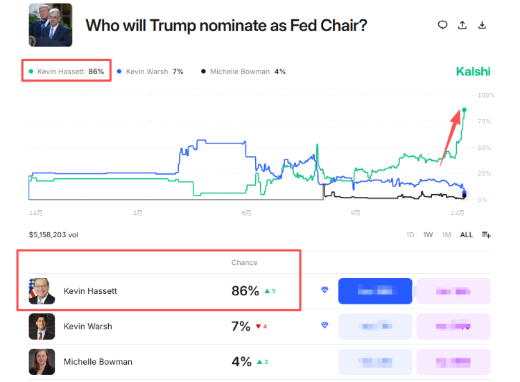 [db:图片]编者按:当选美联储主席概率已达86%!哈塞特持股Coinbase超百万美元,除了加密市场外,若哈塞特上任后还利好哪些港美股?华盛资讯12月3日讯,周二,美国总统特朗普确认2026年初宣布美联储新主席,并在近期多次“直接点名”暗示凯文·哈塞特就是他选中的人,进一步加剧了其作为鲍威尔接班人的揣测。