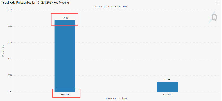 标普500指数再度逼近历史高位宏观周来袭,华尔街交易员普遍预期本周美联储将降息25基点,“圣诞老人行情”能否如期?哪些降息交易值得投资者提前关注?一文带你看懂。降息25基点板上钉钉!鲍威尔VS哈塞特定调美联储“鸽派”or“鹰派”降息25基点板上钉钉!全新2026年降息路径点阵图来袭最新数据显示,市场预测美联储12月会议降息押注已板上钉钉,根据芝商所美联储观察工具(CME FedWatch Tool)的数据,联邦基金利率本周降低25个基点至3.5%-3.75%的概率约为87%。降息概率近期陡增,来源于压力不断加大地美国就业市场,上周公布的ADP就业数据出现2023年3月以来最大降幅,远逊于市场预期,同时PCE数据显示通胀放缓。