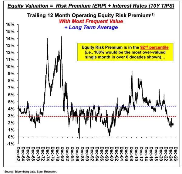 另一张图标则显示了标普500指数的股票风险溢价,即在当前估值水平下,股票预期收益高于国债收益率所代表的无风险收益的部分。该指标正接近上世纪90年代末和本世纪初互联网泡沫时期的水平。