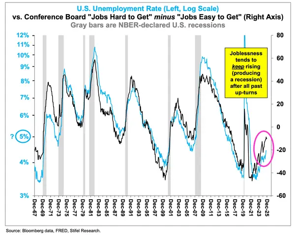 [db:图片]来源:科创板日报 财联社12月13日讯(编辑 黄君芝)美国知名投行Stifel的首席股票策略师Barry Bannister最新预计,如果美国经济在2026年保持良好,标普500指数将上涨9%。但一旦经济衰退来袭,投资者应该做好基准指数迅速下跌20%的准备。 “美联储正在放松政策,但衰退风险(标准普尔500指数快速下跌20%)并非微不足道,”他在最新报告中写道。 不过值得注意的是,经济衰退既非Stifel,也并非华尔街任何一家大行对明年的基本预期。而且,美联储也刚刚上调了对2026年的经济增长预测,Stifel认为经济衰退发生的可能性约为25%。 但与此同时,Bannister也强调,如果经济出现问题,美国股市仍有可能经历一段艰难时期。 首先,他解释称,劳动力市场似乎有些不稳定,失业率和裁员人数在上升,新的就业机会很少。如果就业市场继续严重恶化,那么消费者可能会开始集体捂紧钱包。对于一个68%的GDP来自消费支出的经济体来说,这无疑是个坏消息。 考虑到股票估值目前处于历史高位,这可能会给投资者带来麻烦。该行表示,二战以来经济衰退期间,股市回调的中位数为20%,而平均跌幅为23%。 “市盈率本身并不重要……直到它成为唯一重要的指标,而标准普尔500指数又太贵了,” Bannister补充道。 如果熊市真的到来,投机性最强的资产将率先下跌,随后是整体市场。Bannister追踪的七只高波动性股票——包括Palantir、Strategy和GameStop——被用作投机偏好的指标,这些股票在过去几个月里大幅下跌。 在最新报告中,他还附上了几张图标,描绘了一幅令人担忧的画面。其中一张图表突显了失业率失控上升的趋势。