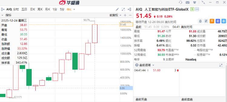 美股规模最大AI主题ETF年内涨幅超33%,录得连续第三年上涨另一方面,从AI存储芯片、AI光通信、AI机器人、量子计算、AI应用等产业链上下游公司,股价开始集中爆发,美股“AI主题交易”呈现出百花齐放姿态。当下,站在2025年的尾声,回望AI技术爆发的又一年,哪些公司抓住了AI红利实现股价暴涨?2026年AI交易还能继续长青吗?一文带你看懂。最高狂涨逾600%!年度“AI超级牛股”出炉,你抓住了几个?从榜单来看,2025年随着AI数据中心对存储芯片指数级需求,行业迎来 “超级涨价周期”;在此背景下,闪迪SanDisk $SNDK 公司以613%的涨幅登顶2025年年度AI牛股榜单。与此同时,存储概念西部数据年内同样涨超322%,巨头美光科技年涨超242%。摩根大通预计,存储芯片正在迎史上最长景气周期,AI推理对内存消耗是训练3倍,产品供需缺口将延续至2027年;预计2026财年DRAM价格暴涨53%,头部厂商市值2027年将飙至1.5万亿。