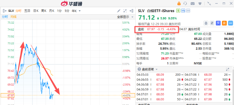 [db:图片]华盛资讯12月29日讯,今年以来,现货白银累计暴涨超180%,市值一度超越苹果、谷歌等科技巨头股票,成为全球第三大最有价值资产,仅次于黄金和英伟达。热烈狂欢后,本周一白银突发跳水,现货白银早间突破84美元再创历史新高,随即开始剧烈回调,截至发稿,白银ETF $SLV 盘前回调4%,黄金跌近2%。