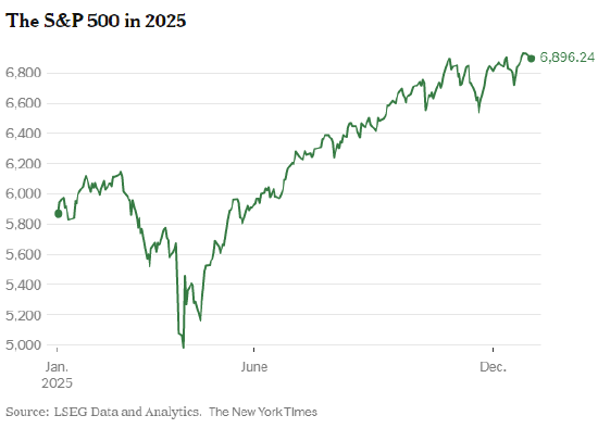从表面看,美股 2025 年收官点位基本符合分析师年初预期,但其上涨过程却跌宕起伏。 一年前,分析师预测美股将稳步走高,经济学家预判美联储会降息;特朗普总统连任后,市场观察人士普遍认为,利好企业的政策环境将为经济发展赋能。 一年过去,标普 500 指数累计上涨超 17%,美联储已降息 75 个基点;尽管美国经济显现疲软迹象,低收入群体生活成本担忧加剧,但整体经济状况尚可。 然而,对全年深耕市场的投资者和交易员而言,这绝非一段平稳且可预判的行情。 最终,本轮美股上涨的核心逻辑归结为一个关键共识:人工智能将成为支撑股市的跨时代力量—— 一方面,算力基础设施建设需要巨额投资,另一方面,人工智能技术有望带来显著的生产效率提升。 康宁资产管理公司北美首席投资官辛迪・博留表示:“人工智能赛道景气度向好时,股市便一路高歌;一旦赛道情绪降温,结果可想而知。” 开局坎坷:通胀阴霾 + 关祱冲击,市场一度暴跌 2025 年初,市场笼罩在通胀担忧中,同时有消息称,一家中国企业研发出的人工智能技术,成本远低于美国企业,且竞争力不俗。 随后,特朗普政府的关祱政策接踵而至。4 月 2 日,美国宣布对数十个国家加征大范围关祱,直接引发美股暴跌,标普 500 指数一周内跌幅超 12%。关祱实施方式杂乱无序,市场担忧其将推高通胀、侵蚀企业利润、损害消费者利益,投资者信心遭受重创。 债券市场的恐慌反应,迫使美国政府迅速收回部分关祱举措。 此后,关祱落地延迟、美联储降息、科技股领涨,推动标普 500 指数在5 月至 10 月的每个月均刷新历史高点。 值得注意的是,本轮上涨无视了诸多利空因素:联邦政府裁员、特朗普威胁削弱美联储独立性、政府债务高企担忧、大规模驱逐移民行动,以及司法体系与政府权力制衡面临的挑战。 这些隐患,都被人工智能龙头企业的持续上涨所掩盖,也让美股其他板块的平淡表现黯然失色。但与此同时,市场也担忧投资者对人工智能的押注已过度狂热。 曼集团首席市场策略师克里斯蒂娜・胡珀坦言:“当前市场泡沫化特征明显,我坚信美股正走向下行周期,基准预判是 2026 年美国将迎来温和衰退。”