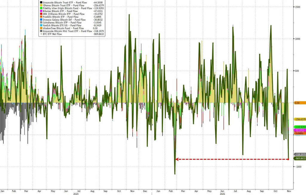 RBC Capital Markets衍生品策略主管Amy Wu Silverman警告,风险在于散户群体长期以来“市场总是上涨”的集体信念可能开始动摇,因为损失正集中在他们今年借以致富的那些股票上。 波动率飙升考验散户承受力 与大盘指数的相对平稳不同,11月的市场伤害具有高度的集中性,主要体现在散户投资者扎堆的投机性资产上。 动量股正在下跌,曾经备受追捧的AI概念交易也出现了剧烈逆转,这些都是本月市场亏损最深的领域。 据摩根大通数据,周四散户仅向美国股票投入6.52亿美元,这一数字仅处于过去一年的第24百分位。根据巴克莱股票兴奋指数的一个月移动平均值,散户股票参与度在短时间内出现“显著下降”。 野村证券跨资产策略董事总经理Charlie McElligott表示,11月无疑对散户造成巨大的“负面”财富效应打击。他说:投资组合损失,尤其是股票和加密货币导致财富感降低,进而可能负面影响情绪,降低支出和消费。 币圈“信仰”动摇 加密货币领域的持续低迷是另一个鲜明的迹象,自10月10日闪崩以来,市场的冲击波几乎没有减弱的迹象。 周五比特币一度下跌5%,使其11月累计跌幅扩大至20%左右。周四比特币ETF更是遭遇了自成立以来第二大资金流出。