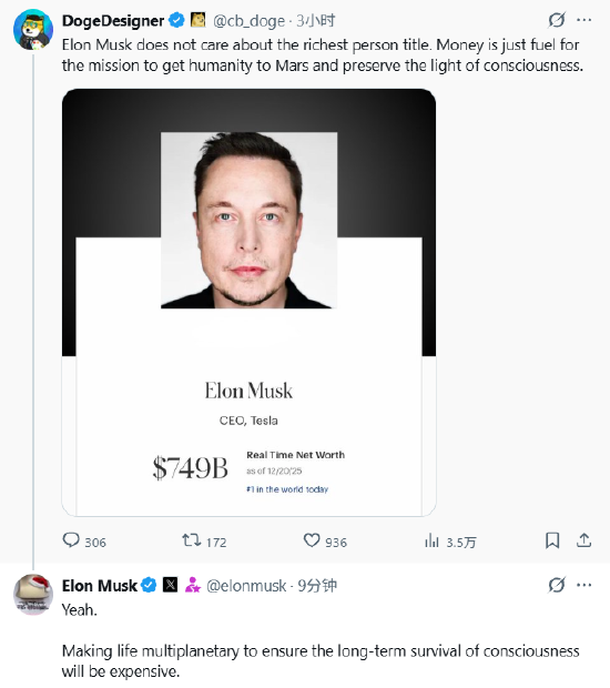 [db:图片]有博主发文称“埃隆・马斯克并不在乎世界首富的头衔。财富不过是推动一项使命的燃料 —— 让人类登陆火星,延续文明火种”,并配图马斯克身家于上周五晚间飙升至7490亿美元。 马斯克回应称:“的确如此。要实现生命的多行星生存、保障文明的长久延续,这项事业必将耗资不菲。”