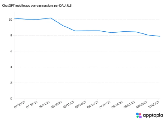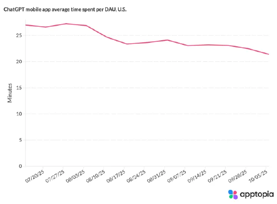 除 “增长触顶” 这一核心因素外,还有其他原因可能影响了 ChatGPT 的表现。这不仅包括来自谷歌 Gemini 的竞争压力,还涉及 4 月一次更新后用户使用行为的变化 —— 那次更新旨在降低 ChatGPT 聊天机器人 AI 模型的 “迎合性”;随后在 8 月发布的 GPT-5 模型,据称其 “人性化程度” 也有所降低,这一趋势得以延续。 不过,Apptopia 指出,在竞争对手谷歌 Gemini 大幅崛起之前,ChatGPT 的日活跃用户平均使用时长和平均使用次数这两项指标就已呈下降趋势。谷歌 Gemini 之所以能在 9 月跃升至应用排行榜前列,得益于谷歌新推出的 AI 图像模型 “Nano Banana”。 因此,该机构认为,尽管 Gemini 的增长可能对 ChatGPT 近期部分核心指标的下滑产生了影响,但无法解释其整体趋势。