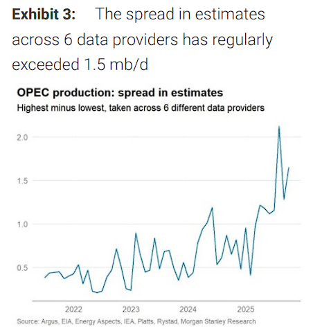 OPEC产量数据迷雾:分歧达到创纪录水平 研报称,石油市场的核心矛盾正在于一个日益棘手的难题——OPEC产量数据的可靠性。 摩根士丹利追踪的六家专业数据提供商——Argus、美国能源信息署、Energy Aspects、国际能源署、Rystad和标普全球大宗商品——对OPEC原油产量的估算在2020-2022年期间误差仅为400-500千桶/日,但从2023年初开始出现分化,到2025年分歧已扩大至常态性超过1.5百万桶/日。