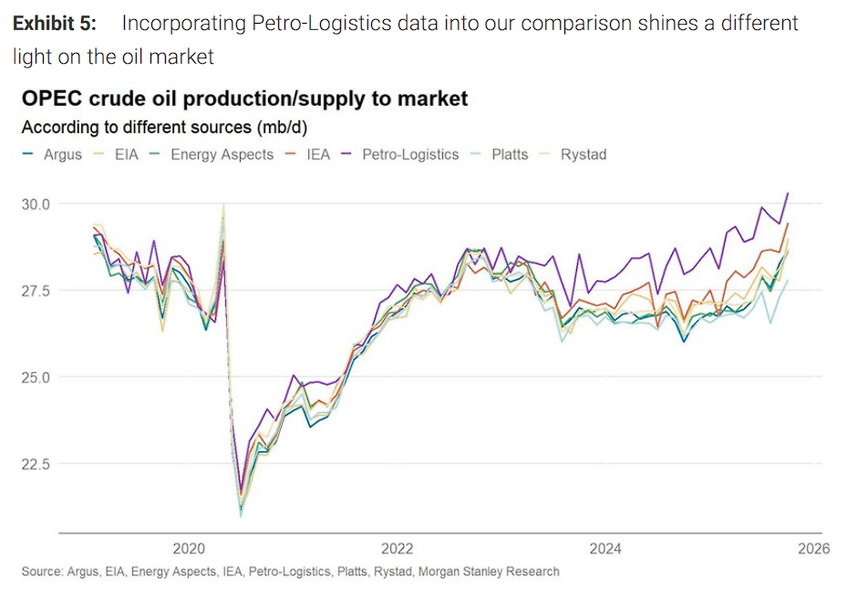 在咨询了大量实物交易市场人士后,大摩得到的反馈出人意料:多数业内人士认为Petro-Logistics的估算“最为准确”。该机构专注于OPEC产量估算已超过45年,基于庞大的信息来源网络、卫星油轮追踪和政府报告,并提供透明的数据构建方法。 大摩表示,如果Petro-Logistics的较高估算确实更接近真相,这将从根本上改变市场对OPEC产能、需求和再平衡路径的理解。 OPEC增产承诺的真相:配额追赶实际产量 大摩称,OPEC今年的增产计划在这一背景下呈现出完全不同的面貌。 今年3月,OPEC宣布开始解除总计每日220万桶的减产配额,并在9月完成。随后,OPEC又开始解除另一层每日165万桶的减产,以每月13.7万桶的速度推进,按此速度将在2026年9月完成。 这种快速解除减产的做法令人惊讶,尤其是在多数分析师(包括大摩)已经预测未来几个季度将出现大量过剩的背景下。然而,Petro-Logistics的数据显示:这些产量实际上已经存在。2025年9月的产量数据已经超过了完全解除165万桶/日减产后的隐含产量水平。 大摩表示,换言之,如果这一数据准确,OPEC解除减产并非真正增加产量,而只是让配额追赶实际产量。这一点已经有所体现:3月至9月期间,虽然解除了250万桶/日的减产(包括阿联酋30万桶/日的基准调整),但OPEC实际产量仅增加了约85万桶/日。 闲置产能远低于预期 闲置产能是石油市场的重要“安全垫”,决定了OPEC应对供应中断或需求激增的能力。 大摩认为,如果OPEC产量确实比多数数据提供商显示的更高,那么其闲置产能,以及未来的供应增长潜力很可能也更低。 研报指出,利用国际能源署对OPEC产能的估算,结合Petro-Logistics的最新产量数据,当前OPEC的闲置产能约为2.9百万桶/日,处于历史上相对较低的水平。 大摩通过数据指出,290万桶/日的闲置产能,仅占全球石油消费的约2.8%,且历史上健康的闲置产能通常在400-500万桶/日。 大摩认为,这对中短期供应前景具有重要意义。从长期看,OPEC国家可以通过进一步投资扩大产能,但在2026-2027年的时间框架内,现有闲置产能基本决定了可能的产量增长空间。如果这一缓冲空间确实有限,市场对OPEC大规模增产能力的预期可能过于乐观。 真实需求可能被系统性低估 大摩在研报中强调,最重要的发现是:如果OPEC产量确实更高,这可能意味着石油需求,以及需求增长比普遍认为的更加强劲。 表面上看,Petro-Logistics对OPEC产量的更高估算似乎对油价不利,毕竟这意味着更多供应。但这忽略了一个关键动态:这些额外的石油去了哪里? 在全球层面,进出口相互抵消,因此只有两种可能:1)被消费了,即需求也被低估;2)被储存在我们无法观察到的设施中。 大摩的分析表明,不可观测的储存不太可能是完整解释。自2023年初以来,IEA与Petro-Logistics对OPEC产量估算的累计差异达到8.2亿桶原油,相当于全球可观测原油库存总量(56亿桶)的15%,是美国战略石油储备的两倍。 大摩认为,如此大规模的库存在如此短时间内积累,石油市场不可能不注意到。OECD国家自1980年代中期以来就有可靠的库存数据,非OECD国家的卫星数据也已相当成熟。这些因素表明,这8.2亿桶中的大部分并未被储存,而是被消费了。 研报称,这一推论并非纯粹臆测。油市规模庞大,确实存在多个数据盲区。 目前IEA与Petro-Logistics对OPEC产量的估计差异约相当于全球石油需求的1%。考虑到俄罗斯以及中东、非洲大部分地区的石油消费数据报告有限,约1%的需求被“遗漏”完全有可能。 事实上,仅各数据提供商对2025年上半年全球石油液体需求的估计,Argus为10230万桶/日,而标普全球大宗商品为10500万桶/日,差距也达到270万桶/日。 需求增长趋势可能更为强劲 大摩指出,更关键的是,这种产量估算分歧不是静态的,而是不断扩大的趋势。2023年之前,IEA与Petro-Logistics的估算差异很小且相对稳定。但自2023年初以来,这一差距以每年约36万桶/日的速度扩大。