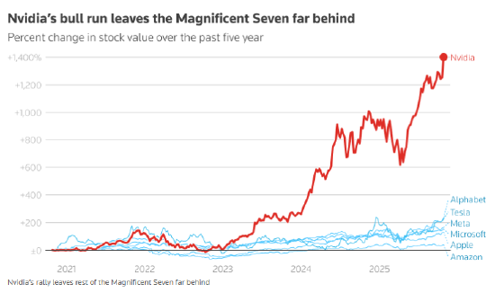 自2022年ChatGPT推出以来,英伟达股价已上涨12倍。人工智能热潮推动标准普尔500指数创下历史新高,同时引发市场争论:泡沫化的科技估值是否会催生下一个大型泡沫。 而过去5年间,英伟达市值上涨的幅度在美股七巨头之中遥遥领先。