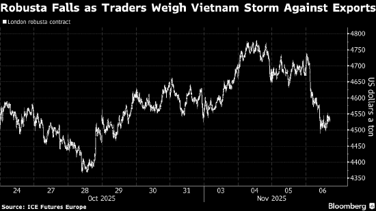 伦敦罗布斯塔咖啡期货下跌,交易员权衡全球最大罗布斯塔咖啡豆生产国越南的强劲出口量与预计将席卷该国主要产区的台风影响。 最活跃合约一度下跌4.2%,至每吨4489美元,因越南海关最终数据显示,该国10月咖啡出口量同比激增约55%。随着台风海鸥逼近越南,这场风暴将在该国主要咖啡产区带来暴雨,可能损害作物。 越南2025-26年度咖啡采收于上月启动,中部的暴雨可能损毁植株、延误采收并影响豆质。但Sucafina气象策略师Greg Oddo指出,这一情况预计不会显著改变整体供应前景,因为较高的价格将激励农民收集掉落的咖啡果实。 价格: 伦敦罗布斯塔咖啡下跌3.1%,至每吨4,540美元。纽约时间10:49,阿拉比卡咖啡下跌2.4%。 可可期货在纽约下跌2.7%,在伦敦下跌2.9%。 新浪财经公众号 24小时滚动播报最新的财经资讯和视频,更多粉丝福利扫描二维码关注(sinafinance)
