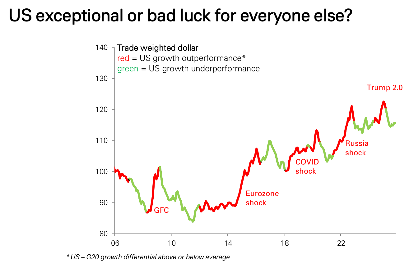 由于美联储的货币政策是驱动美元大幅波动的最主要因素,其相对收益率优势的丧失,移除了支撑美元价值的一个关键基石。 支柱二:美国增长“例外论”的终结 过去数年,美国经济相对于其他主要经济体的卓越增长表现,即所谓的“美国例外论”,是吸引资本流入并推高美元的另一强大动力。然而,这一趋势也正在逆转。 报告指出,过去近二十年里美元走强往往伴随美国相对其它G20经济体的增长更强,而这种“美国例外”很多时候并非美国本身速度特别快,而是全球不断出现对其他地区更具杀伤力的冲击(如欧债危机、疫情、俄乌冲突)。因此,每当世界出事、他国受挫,美国就显得相对更强,美元随之走高。简而言之,美元强势更多来自“别人更糟”,而不是“美国太强”。