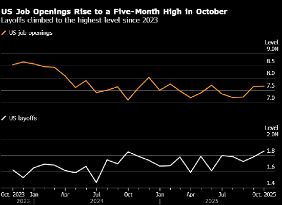 [db:图片]美国10月职位空缺攀升至五个月来最高水平,但招聘减少和裁员增多表明劳动力市场仍在持续放缓。 根据美国劳工统计局周二公布的数据,职位空缺数量在10月小幅增至767万,高于9月的766万。职位空缺数量超过所有接受调查的经济学家预估。这两个月的数据发布均因政府关门而被推迟。