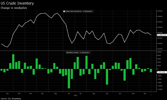 截至2025年12月26日当周,美国原油总库存(不包括战略石油储备)降至42288.8万桶,为2025年10月31日以来最低水平。当周原油库存减少193.4万桶,为2025年11月14日以来的最大降幅。 新浪财经公众号 24小时滚动播报最新的财经资讯和视频,更多粉丝福利扫描二维码关注(sinafinance)