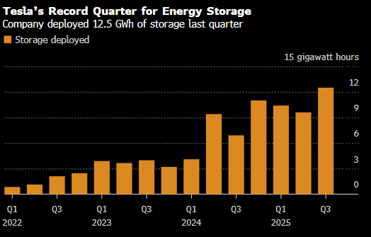 尽管特斯拉上半年销售疲软,投资者近期将注意力转向了马斯克对自动驾驶、人工智能和机器人领域增长前景的承诺。9月份,特斯拉股价大涨33%,收复年初以来失地,市值增加4,019亿美元。 截至纽约时间周四上午11:00(北京时间23:00),该股下跌1.3%。 美国电动车市场近期因至多7500美元的联邦税收抵免即将到期而受到短暂提振。在9月30日后该补贴将逐步取消的背景下,通用、福特和现代等品牌的车型销量大幅增加。 特斯拉将于10月22日公布财报。下月,该公司还将召开年度股东大会,届时投资者将就一项潜在价值达1万亿美元的马斯克薪酬方案进行投票。 Model 3与Model Y、SUV的合计交付量为481,166辆,同比增长9.4%。而其他车型(包括Model X、Model S及Cybertruck)的销量则下降30%。 此外,公司还报告称本季度部署了12.5吉瓦时的能源产品,较去年同期的6.9吉瓦时大幅增长。特斯拉同期还推出了下一代储能系统,以及一款名为Megablock的将储能单元与变压器和配电装置集成的新产品。