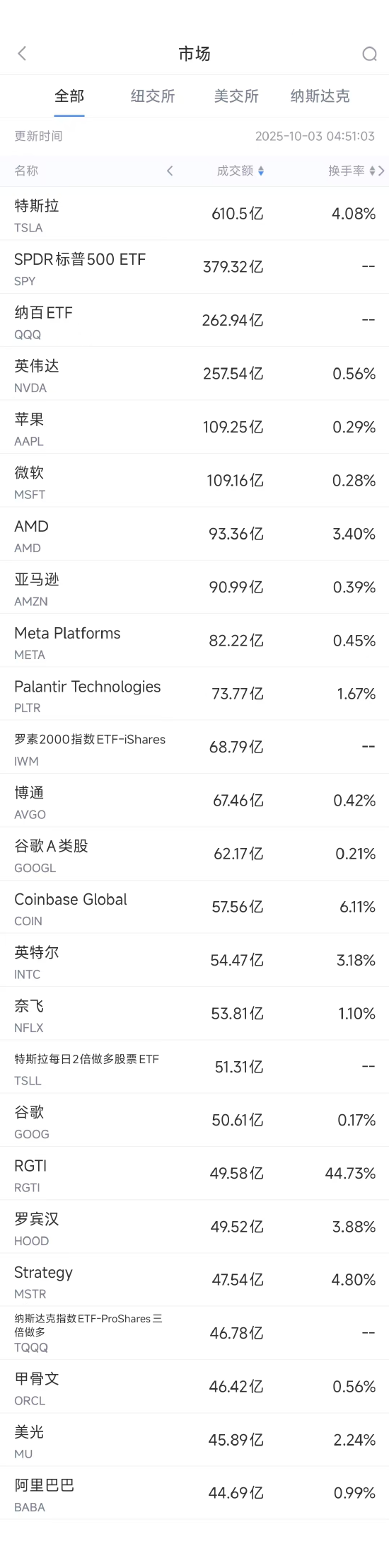 - 编辑:admin -10月3日美股成交额前20:英伟达六连涨并创新高