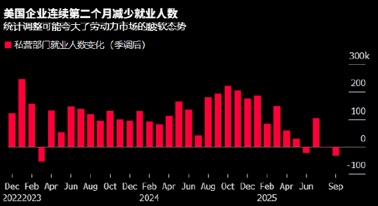 这些数据基本符合官方数据中断前低招聘、低解雇的状况。若这种态势持续到月底,很可能足以促使美联储再次降息 —— 而这也正是投资者所预期的。 “即使没有就业报告,我们也能对劳动力市场状况形成印象,”摩根大通首席美国经济学家Michael Feroli表示。“综合我们看到的所有信息,我认为他们可以在本月晚些时候放心降息。” 美国劳动力市场最新数据的概况如下: 招聘 由于非农报告缺席,ADP Research发布的私营部门就业数据是本周劳动力市场最受瞩目的指标。尽管经济学家通常对ADP数据持怀疑态度(因其有时与政府统计值存在偏差),但本次数值受统计调整影响,使得解读更为困难。 ADP报告显示,美国企业9月就业人数减少3.2万人,8月经修正后为减少0.3万人。尽管该数据可能夸大了劳动力市场的疲软程度,但ADP表示这并未改变近期的招聘趋势,多数行业就业增长势头仍在持续减弱。