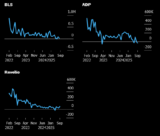 像ADP这样的私营企业未必试图将自身定位为劳工统计局非农报告的领先指标,但投资者会根据其数据与官方数据的吻合程度等因素来对它们做出评判。Revelio Labs公司基于超过1亿份美国就业档案(这些档案反映了全国劳动力状况,覆盖三分之二的就业人口)指出,上月雇主新增就业岗位约6万个。 经济学家不对Revelio数据做出预测,但对政府数据有预测 —— 其中位数预测为新增5.3万人。这家劳动力情报公司表示,其模型预测劳工统计局原本料公布9月新增就业人数3.8万人。 “综合来看,证据表明劳动力市场仍在扩张,但已接近停滞状态,”Revelio在报告中指出。“当前劳动力市场看上去稳定但脆弱。” 与此同时,美国供应管理学会(ISM)的数据显示,制造业就业人数自2023年初以来,除三个月外的每个月均有所萎缩。周五公布的数据显示,服务提供商的就业人数在9月份出现了连续第四个月的萎缩。 “限制性的政策利率、关税成本挤压利润、政府资金削减及裁员潮,加之移民放缓导致需求疲软等基本面因素,预示今年招聘活动将进一步萎缩,”花旗集团经济学家Veronica Clark在一份报告中指出。 彭博经济研究周四在报告中称,为较小企业提供劳动力管理软件的Homebase数据显示,9月就业人数可能实现了“可观的增长”,增幅约15万人。 美国劳工部长Lori Chavez-DeRemer周五对福克斯商业台表示,一旦政府重启,就将发布9月就业数据。 职位空缺 职位空缺数在2022年达到峰值,此后持续下降,直至过去一年趋于稳定。劳工统计局在政府停摆前于周二发布的最新数据显示,8月职位空缺基本持平,招聘活动低迷,表明劳动力需求正逐步减弱。 政府数据最受看重,而职位空缺调查常因低响应率及有时的大幅修正而受到批评。招聘网站Indeed的另一项指数(每日更新)显示,8月职位空缺数基本持平,9月则出现了更显著的下滑。