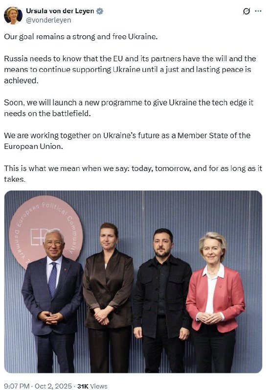 [db:图片]据欧盟委员会主席冯德莱恩与欧洲理事会主席科斯塔在社交平台X上发布的帖子显示,二人向乌克兰总统泽连斯基承诺,将“启动一项新计划”,称该计划将为乌克兰在冲突中提供“技术优势”。 这两位欧盟官员写道:“很快,我们将启动一项新计划,为乌克兰提供其在战场上所需的技术优势。” 不过,二人并未明确说明,该计划所指的是此前提及的让乌克兰参与欧洲“无人机墙”项目,还是计划在乌克兰境内新建工厂、生产攻击型武器以替换此前被毁装备的相关方案。 二人表示,“正为乌克兰作为欧盟成员国的未来而共同努力。”