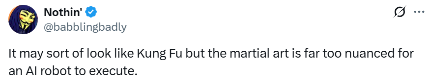 但也有网友表示,“这看起来或许有点像功夫,但武术的精妙程度远非AI机器人所能掌握。”↓