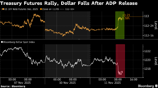 [db:图片]美国国债期货跃升,美元走软。此前ADP Research发布的数据释放美国劳动力市场放缓的信号。 美国国债现货市场因退伍军人节假期休市。ADP数据发布后,10年期美国国债期货上涨。该变幅对应10年期国债收益率下跌约4个基点。该期限国债收益率周一收于4.12%。 货币市场也上调了对美联储降息的押注,与美联储会期挂钩的互换合约显示,市场预期下个月降息的可能性超过60%。对降息的预期升温导致彭博美元指数大幅下跌,触及本月最低点,而欧元和日元兑美元均升至盘中高点。 周二公布的数据“与劳动力市场已趋稳定的观点相悖”,T. Rowe Price首席美国经济学家Blerina Uruci对Bloomberg Surveillance表示,“我们正在密切予以关注,但同时也意识到10月数据有很多干扰因素,而且会受到政府停摆的影响。”